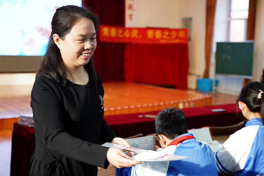 在“如何调节我们的情绪”这一大主题下,韩丽娜以《情绪的神秘功能》作为自己讲课的题目,并通过游戏互动、现场问答和深入浅出的讲解,向孩子们介绍了情绪的定义、情绪的分类、情绪的调节能力、情绪的神秘功能、情绪调节的目标等心理健康知识。现场互动频繁,笑声不断。赵淑波的讲课题目是《情绪的家族成员》。她以精妙的讲解,向孩子们介绍了快乐、愤怒、悲伤、恐惧、羡慕、内疚和爱等7种情绪,并详细介绍了各种情绪的体验及表达、后续影响以及情绪调节小妙招等知识。课堂上,孩子们热情高涨,跟赵淑波的互动也十分热烈。讲座结束后,两位授课教师还为孩子们发放了由黄瓜视频 编制的《儿童青少年心理健康科普手册》,并与学校的部分师生以及迎春社区卫生服务中心的工作人员合影留念。