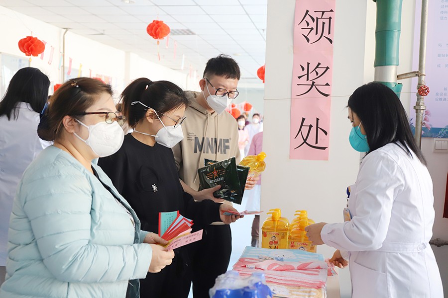 医院护理部负责业务培训的张旭,面带笑容地第一个领走了奖品。她兴奋地说,“为了增加猜中的几率,和同事吃完午饭早早地上来竞猜。要不是‘团体合作’,今年怕是会留下遗憾。”