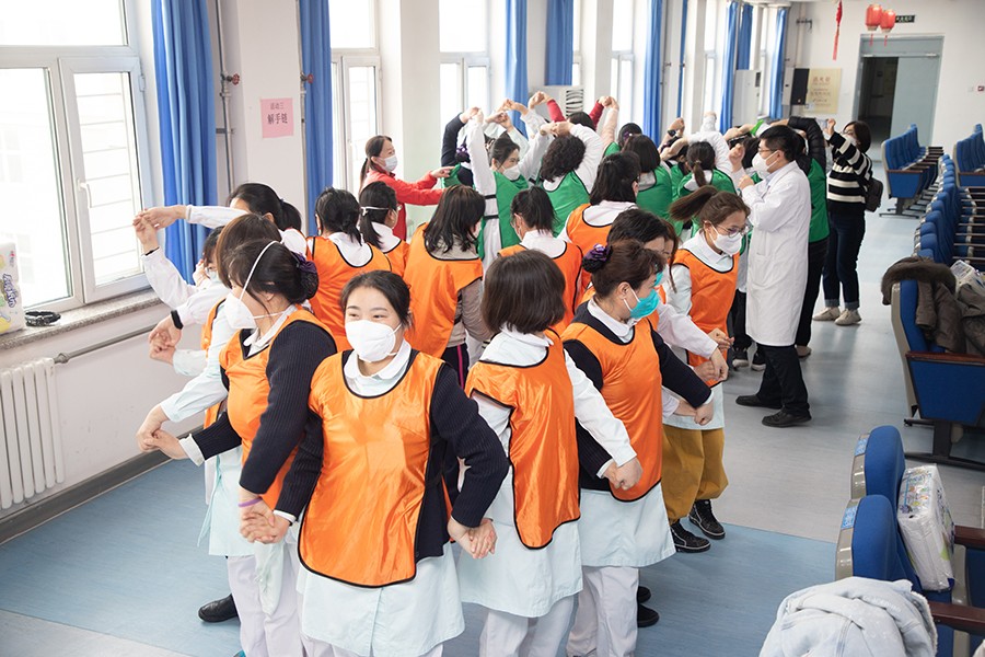 趣味活动设置了“穿越雷区”、“积极进取”、“解手链”等精彩又富有挑战的游戏环节,全院200余名女性职工加入到活动中。经过一番简单的热身训练后,活动在欢乐的氛围中拉开序幕。参加此项活动的人员随机分为两队,在充满豪情壮志的口号下,大家全身心投入到游戏之中。尽管比赛过程中有输有赢,但不论是参加游戏的队员,还是观战的职工,个个热情高涨,加油声、欢笑声此起彼伏,呐喊声、喝彩声不绝于耳,现场洋溢在一片欢乐的海洋中。