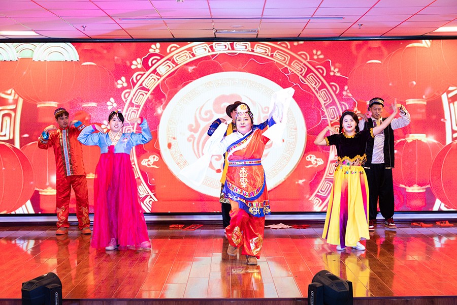 鼓乐滔滔、红浪阵阵。在擂鼓者时缓时急的鼓点声中,舞者手中的龙形彩带宛若一条条身姿矫健、翻腾飞舞的中国龙上下翻飞。蕴含中国传统文化的开场龙鼓舞带来的欢乐与震撼,瞬间点燃全场气氛,新春联欢会就在这热闹的氛围中正式拉开帷幕。