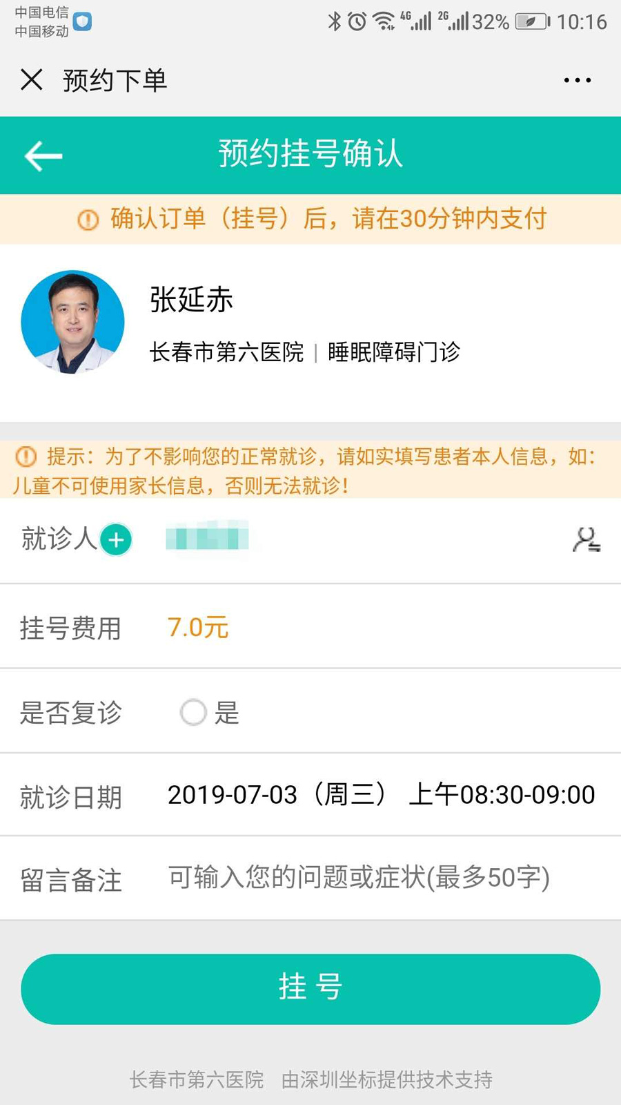 4、就诊时请按预约时间提前半小时到达医院,在挂号室“补打就诊信息凭单”窗口,凭身份信息及“就诊信息凭单”到诊室就诊