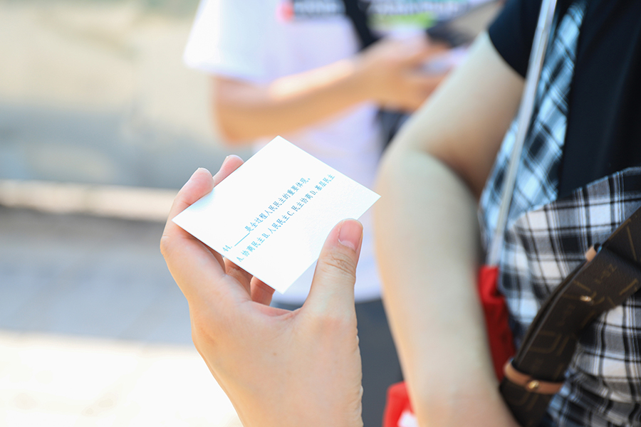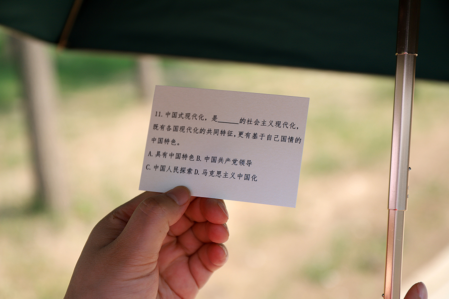 每个答题处,只见党员们拿着答题卡,或双眉紧锁或仰望天空,进行思索,重温党史知识,现场掀起了学习热潮。“什么是全面建设社会主义现代化国家的首要任务。应该是,是高质量发展,选择A”。“恭喜你,回答正确,可以继续闯关了”。答题正确的党员们领取胸贴,骄傲地将其贴在右侧胸前。党员们答题兴致高涨,仿佛忘记了酷暑的炎热。