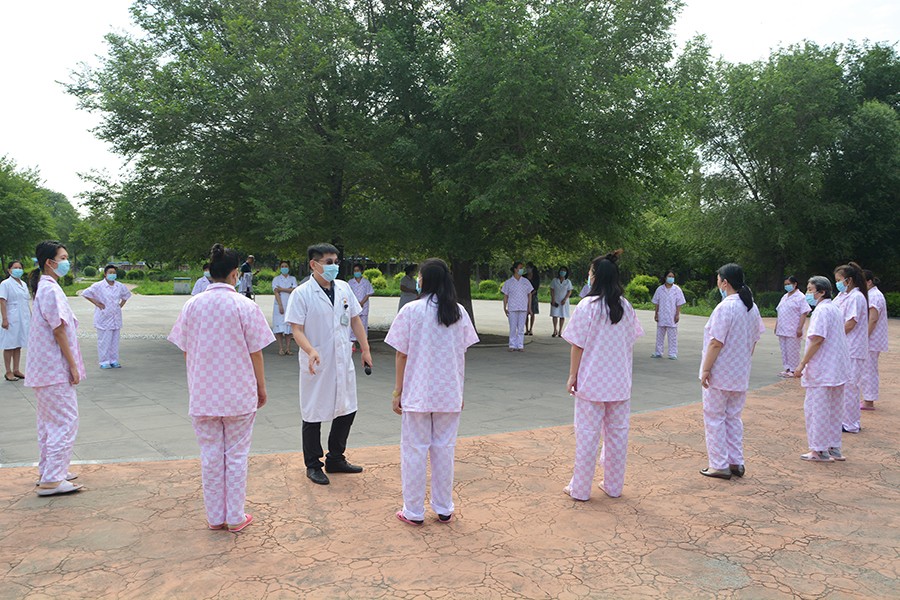6月29日上午,医技党支部和康复科组织住院休养员共同庆祝党的生日。黄瓜视频 党委书记、院长桑红参加了唱国歌、带领休养员户外康复等活动。