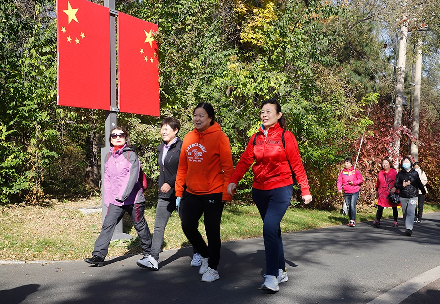 清晨,空气清新,温度舒适,阳光洒在身上,暖暖的。“1、2、1、2……”整队完毕,热身完毕。队伍透着精气神,出发!风中,醒目的院旗迎风招展,领队们走在队前,长长的队伍紧随其后。绕过北普陀寺、走过坝西、过了溢水湾,队伍穿行在森林间,行走在堤坝上。呼吸着清新空气,头顶蓝天、白云,脚下是平整的健康步道。一张张笑脸洋溢着内心的快乐,一双双脚走出健康与自信。