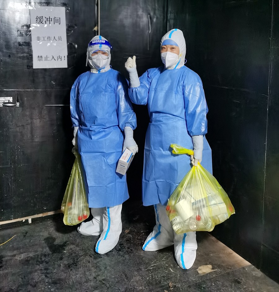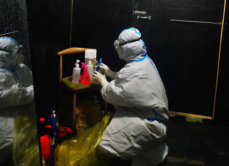 3月19日晚上10点左右,刚结束工作躺在宾馆床上休息的郭桂英接到了新的任务。她以最快的速度收拾行李,赶往集合地点,连夜转战到城开美御隔离点工作。在城开美御隔离点支援的时间里,每天晚上郭桂英都将手机放在自己的耳边,只要有消息,就立刻查看,保证任务一来,就能及时赶到。在这里,郭桂英每天配备脱间的用品,对医废进行处理、转运,同时进行消杀,公共区域及员工通道的消杀每天至少两次。每一项工作结束后,她的衣服都会湿透,超强度的工作也导致她的血压升高,为了不影响工作,她没有告诉领队,吃着降压药坚持到最后一刻。