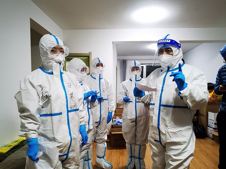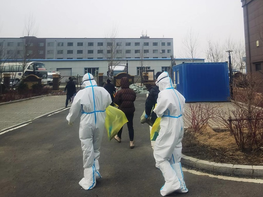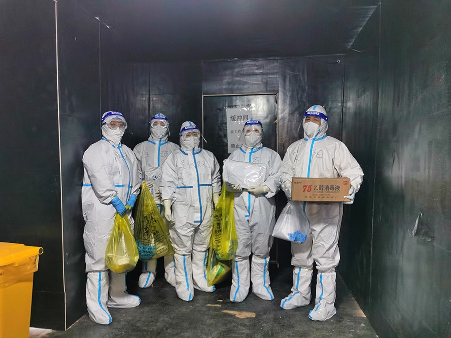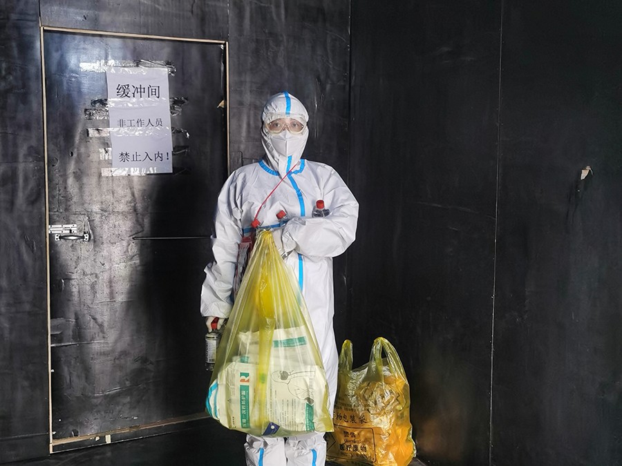 在更换和清理撤离人员留下的生活起居用品时,尹美娇和队友们从15点开始,不知道进行了多少次的收起、装袋、装车、转运、处理,结束工作时已经21点,穿着不透气的防护服,衣服都被汗水浸湿,拖着疲惫的身躯吃着微凉的盒饭,虽然很累、很辛苦,但心里却觉得很值得。