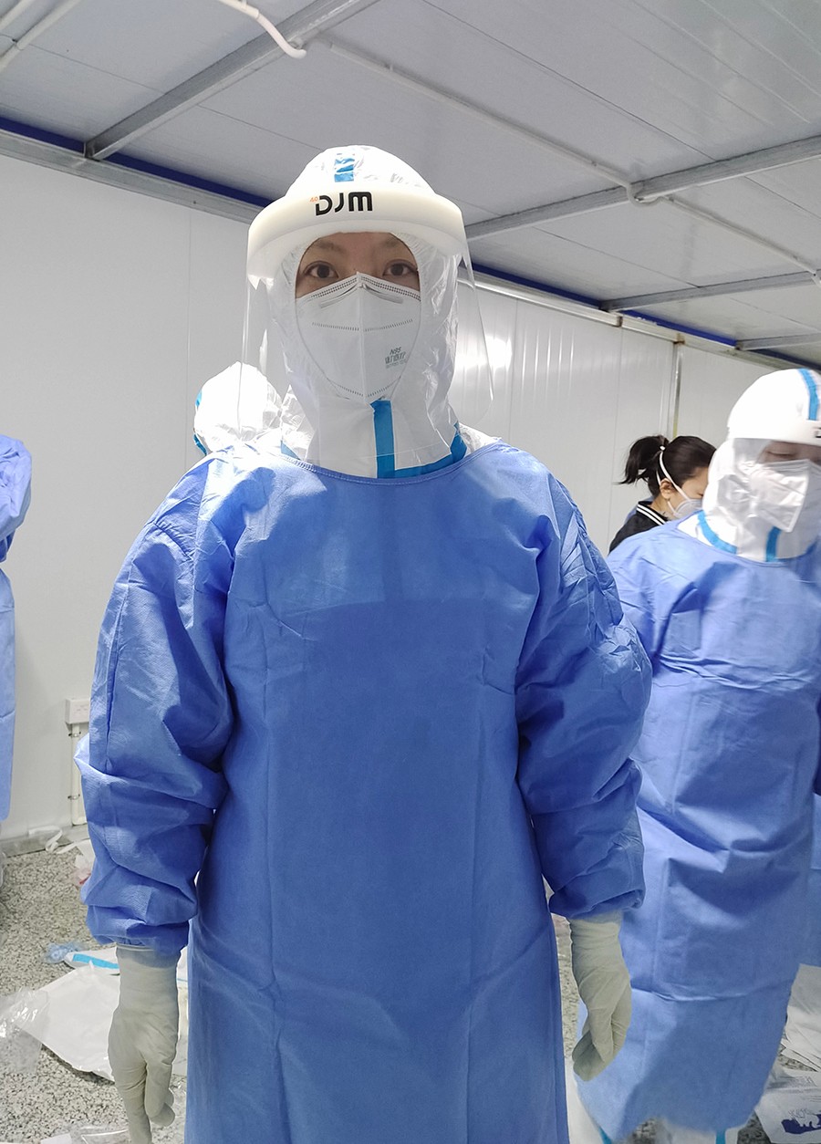 3月20日,尹美娇和队友们来到城开美御隔离点继续她的抗疫历程。在那里,尹美娇主要负责三脱间消杀,医用垃圾处理,密接隔离人员接收、解离,阳性病例的转运等工作。