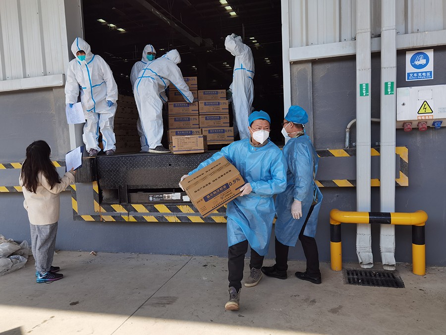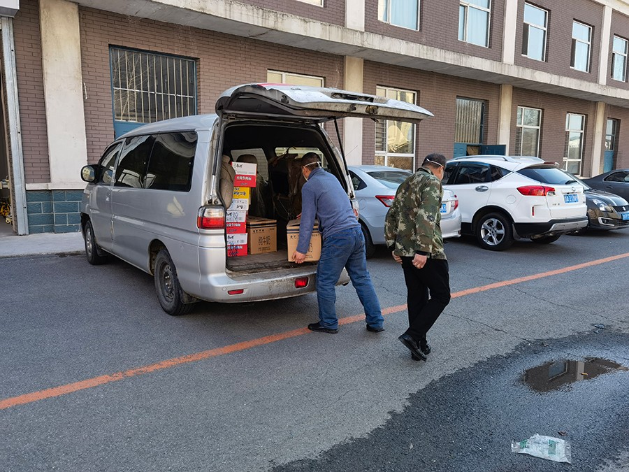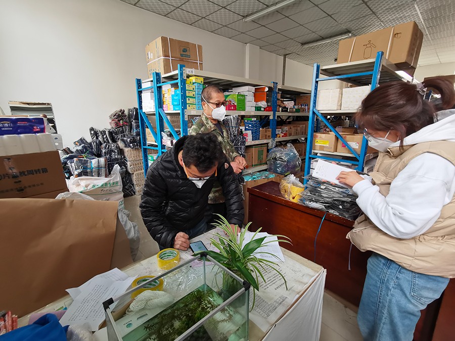▲总务科的党员王雪松在为前线医护人员配发物资