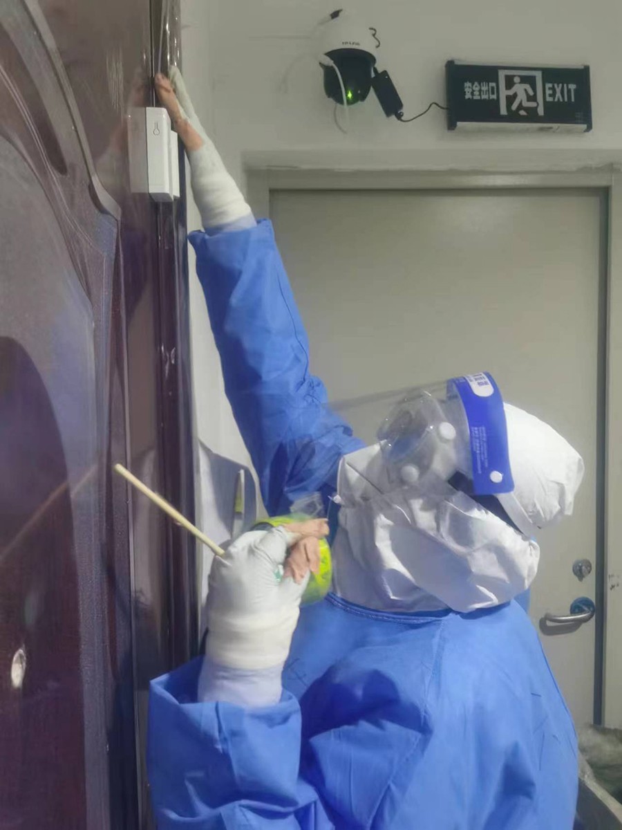 ▲核算科的入党积极分子战莹莹在隔离点安装门磁