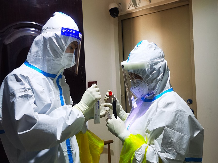 ▲核算科的入党积极分子李肖萌在隔离点参与核酸采样工作