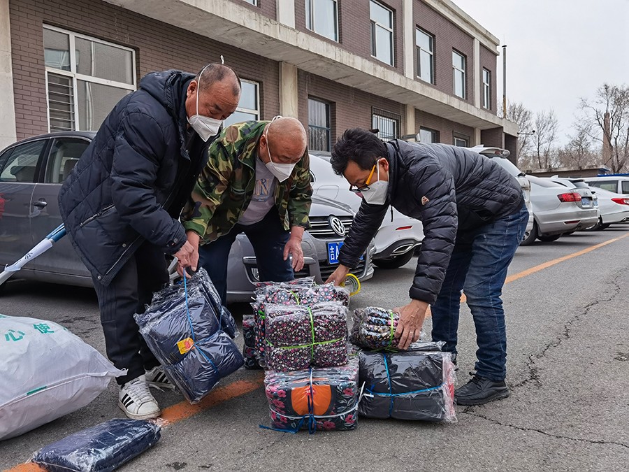 ▲总务科的党员为院内休养员送上了御寒的棉衣等生活物资,将医院的关怀送到了他们的心坎儿上