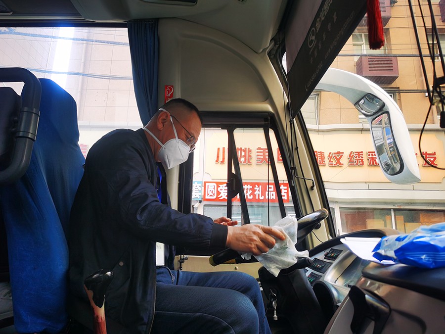 ▲总务科的党员徐震正在对医院班车进行消杀