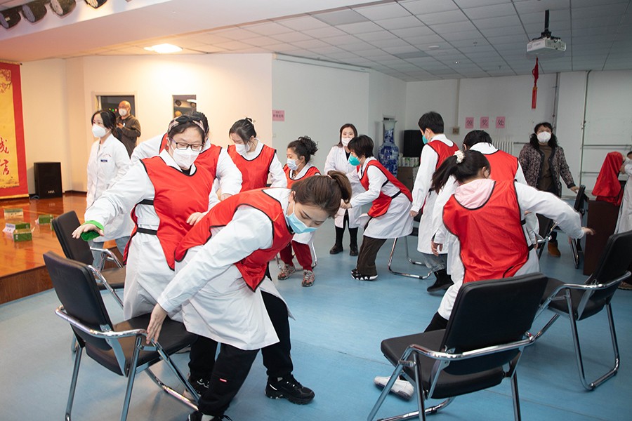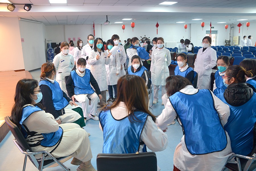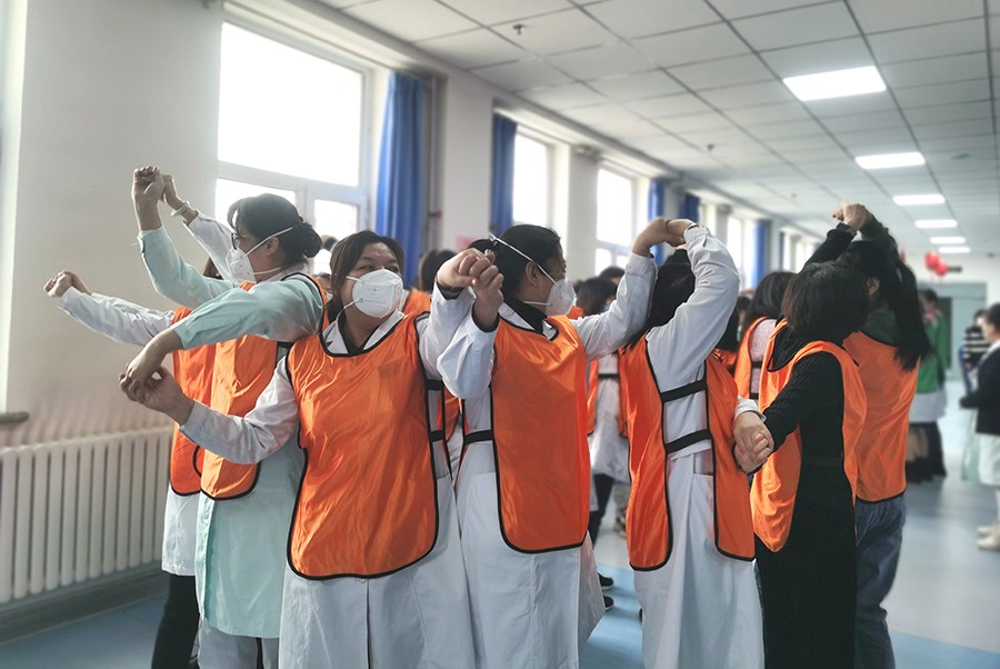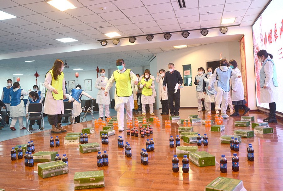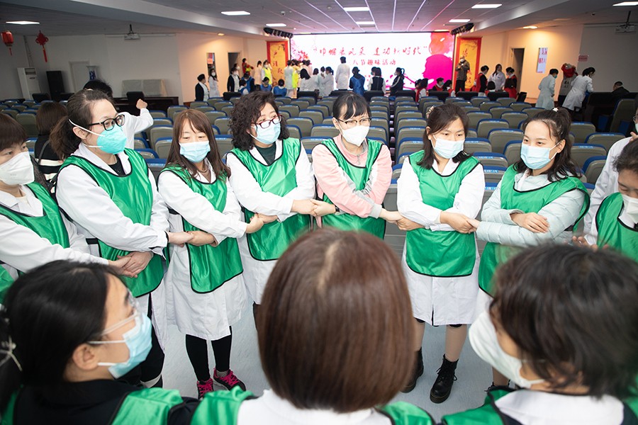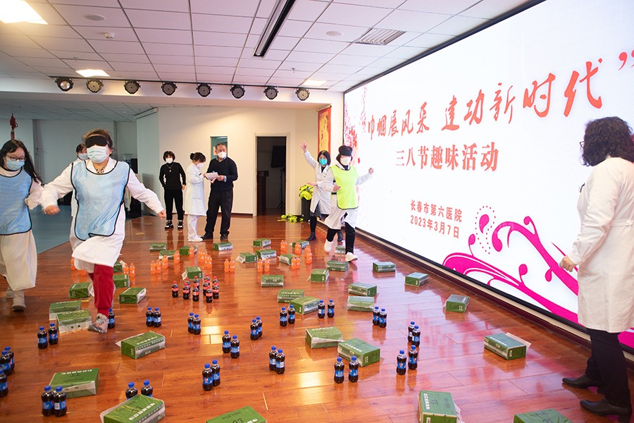 趣味活动设置了“穿越雷区”、“积极进取”、“解手链”等精彩又富有挑战的游戏环节,全院200余名女性职工加入到活动中。经过一番简单的热身训练后,活动在欢乐的氛围中拉开序幕。参加此项活动的人员随机分为两队,在充满豪情壮志的口号下,大家全身心投入到游戏之中。尽管比赛过程中有输有赢,但不论是参加游戏的队员,还是观战的职工,个个热情高涨,加油声、欢笑声此起彼伏,呐喊声、喝彩声不绝于耳,现场洋溢在一片欢乐的海洋中。